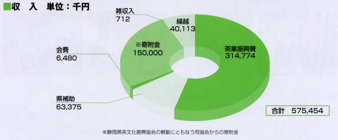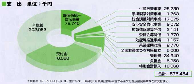 1.茶業振興総合対策事業 (1)生産改善対策事業 28,730千円 県経済連ヘ ア.産地確立対策 イ.静岡茶ブランドの再構築 (2)静岡茶統一宣伝事業 72,740千円 県茶商ヘ ア.大消費地におけるシンポジウムイベントの開催 イ.静岡茶処体験パスツアーの開催 ウ.静岡茶処持集版情報誌「ぐるぐるマップ」の制作 エ.緑茶教室の開催 オ.提案型体験緑茶講座「喫茶楽塾」の開催 (3)手もみ製茶対策事業 1,763千円 県茶手揉保存会へ (4)総合調整対策事業 17,075千円 ア.茶品種普及対策事業 イ.パンフレット発行 ウ.フォトコンテスト事業 エ.茶消費拡大振興計画策定事業 (5)安心安全強化・新需要創造事業 9,072千円 2.委員会等開催費 1,379千円 3.広報・情報収集、発信事業 2,141千円 (1)茶業会議所広報の発行 (2)情報収集及び情報発信 4.茶効能等推進事業 1,157千円 5.茶業振興対策事業 2,776千円 6.全国お茶まつり対策事業積立 5,000千円 7.管理費 34,940千円 8.負担金 5,348千円 9.特別会計繰入 16,060千円 10.交付金 175,200千円 11.茶文化普及啓発事業 0千円 12.繰越金 202,063千円 |